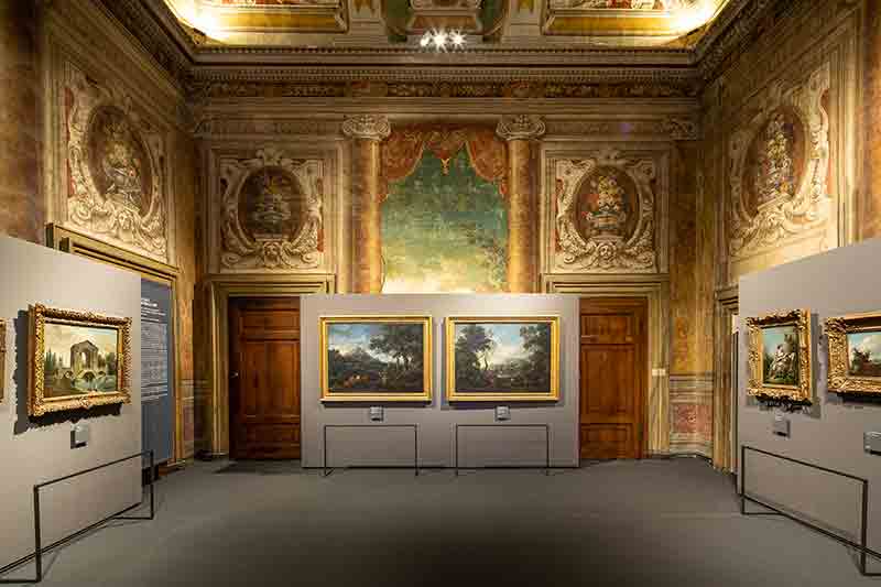 Si passa poi alle vedute esatte, come la magnifica opera di Pietro da Cortona (Cortona, 1596 – Roma, 1669), uno fra i primi quadri da camera con la rappresentazione di un luogo esistente, e del tedesco Jacob Philipp Hackert(Prenzlau, 1737 – Careggi, 1807), il maggior rappresentante del paesaggismo analitico illuminista: i maestri, a distanza di un secolo l’uno dall’altro, raffigurano con maestria la luce inconfondibile del paesaggio romano. E ancora possiamo ammirare i capricci architettonici e le scene pastorali, generi che conobbero una grande fortuna in Italia e in Francia, come testimoniano le tele di Andrea Locatelli (Roma, 1695-1741) e Giovanni Paolo Pannini (Piacenza, 1691 – Roma, 1765), e dei più celebri pittori della corte di Versailles nel Settecento, François Boucher (Parigi, 1703 – 1770), Jean-Honoré Fragonard (Grasse, 1732 – Parigi, 1806) e Hubert Robert (Parigi, 1733 – 1808), che nella capitale pontificia hanno soggiornato come pensionnaires dell’Accademia di Francia. Nei dipinti esposti, Roma e la sua campagna divengono spunti d’ispirazione per rappresentare una natura visionaria, intrisa di sensibilità preromantica, dove le azioni dei personaggi e le architetture fanno da contrappunto all’atemporalità del mondo classico.