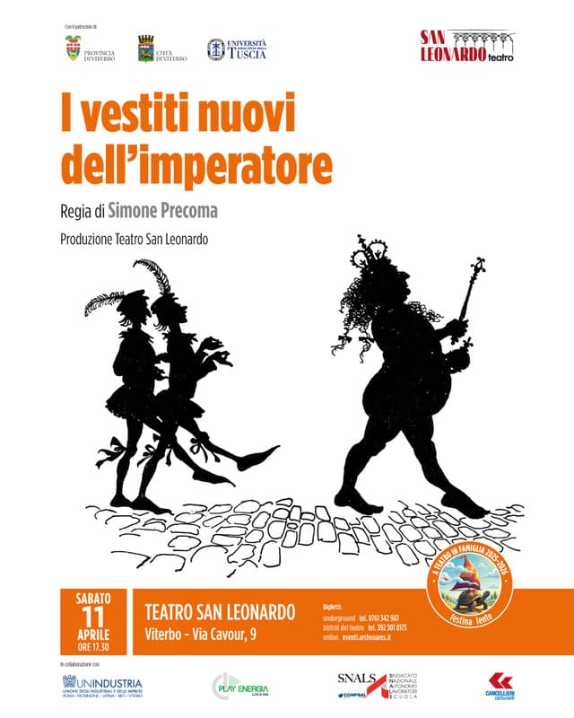 Alle ore 17:30 va in scena “I vestiti nuovi dell’imperatore”, una fiaba senza tempo riscritta con intelligenza e leggerezza, ispirata alla versione di Gianni Rodari. Sul palco prende vita la storia di un sovrano ossessionato dall’apparenza, ingannato da due abili impostori e circondato da una corte che finge di vedere ciò che non esiste. Solo la voce limpida di un bambino riuscirà a rompere l’incantesimo, rivelando una verità tanto semplice quanto potente: il re è nudo.