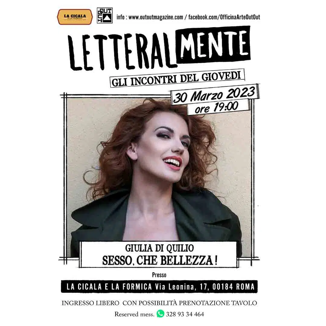 Proseguono gli appuntamenti con “LetteralMENTE – gli Incontri del Giovedì” la rassegna culturale organizzata dall’Officina d’Arte OutOut, associazione culturale apolitica e apartitica, che ogni due settimane porta sul palco del bistrot La Cicala e la Formica esibizioni di cinema, teatro, arte, letteratura e musica.