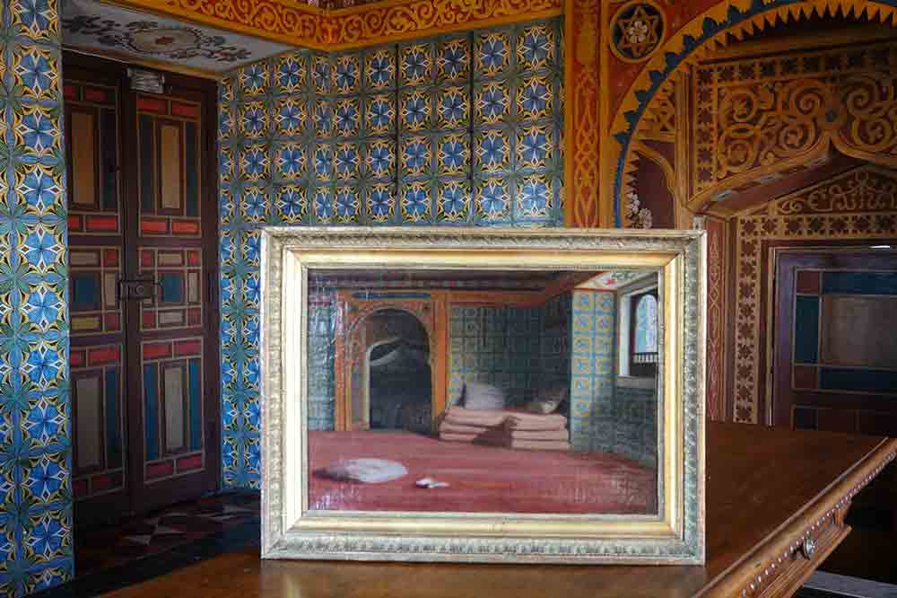 (Foto: Veduta dell’interno della camera turca a Villa Medici e del quadro Chambre de l’artiste à la Villa Médicis, dite la chambre turque, Alfred de Curzon, 1850, olio su tela, 33x47cm.)