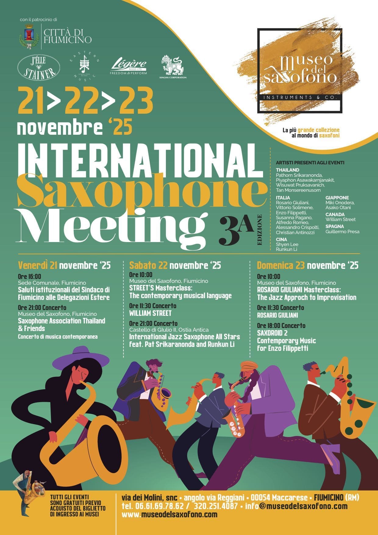 L’evento è organizzato con la collaborazione della Saxophone Association Thailand (SAT) e del costruttore brasiliano J’Elle Stainer, con il patrocinio del Comune di Fiumicino. Sarà un’occasione per vivere da vicino l’incontro tra cultura, arte e innovazione musicale, in un contesto che unisce la bellezza del patrimonio museale con l’emozione della musica dal vivo.
