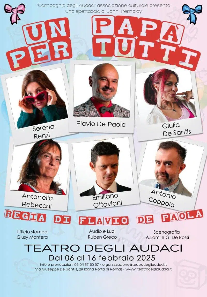 Il direttore artistico del Teatro degli Audaci, Flavio De Paola, ha il piacere di invitare, il suo amatissimo pubblico, presso lo stabile del III Municipio per assistere ad una delle commedie che ha fatto ridere le città più importanti d’Italia: “Un papà per tutti”.